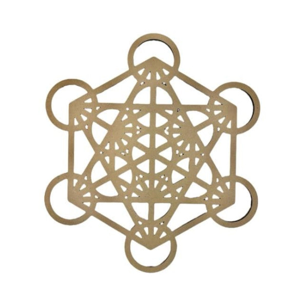 Cette plaque en bois gravée représente le Cube de Métatron, l’un des symboles les plus emblématiques de la géométrie sacrée. Cette figure géométrique complexe regroupe plusieurs formes fondamentales considérées, dans certaines traditions spirituelles et ésotériques, comme les structures de base de la création.